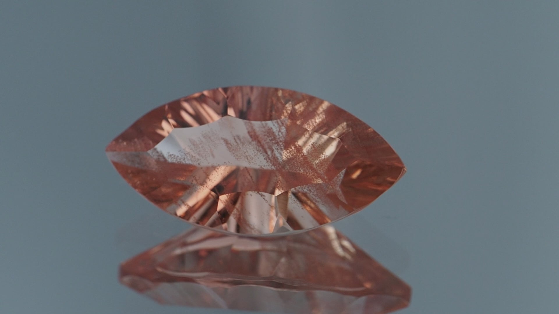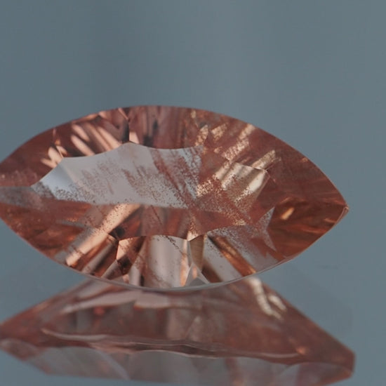 This 4.90 carat concave marquise-cut Oregon Sunstone, measuring 19mm by 9mm, presents a captivating blend of red and orange hues that evoke the warmth of a fiery sunset. This Sunstone is distinguished by numerous exquisite schiller inclusions, which create a dazzling play of light within the gem. The concave cut enhances the stone's depth and brilliance, with its curved facets allowing light to refract and reflect in a unique pattern that highlights the natural beauty of the Sunstone. Mined from Oregon's volcanic terrain, this 4.90 carat Oregon Sunstone with abundant schiller inclusions is a rare and prized gemstone appreciated for its vivid color and intricate internal reflections. The combination of its substantial size and concave marquise cut makes it an ideal centerpiece for jewelry, where its fiery hues and mesmerizing schiller can be showcased with elegance. Whether set in a ring to emphasize its size and shape or crafted into a pendant where its facets can capture and reflect light, this Sunstone promises to captivate with its natural charm and radiant allure, making it a cherished addition to any fine jewelry collection.