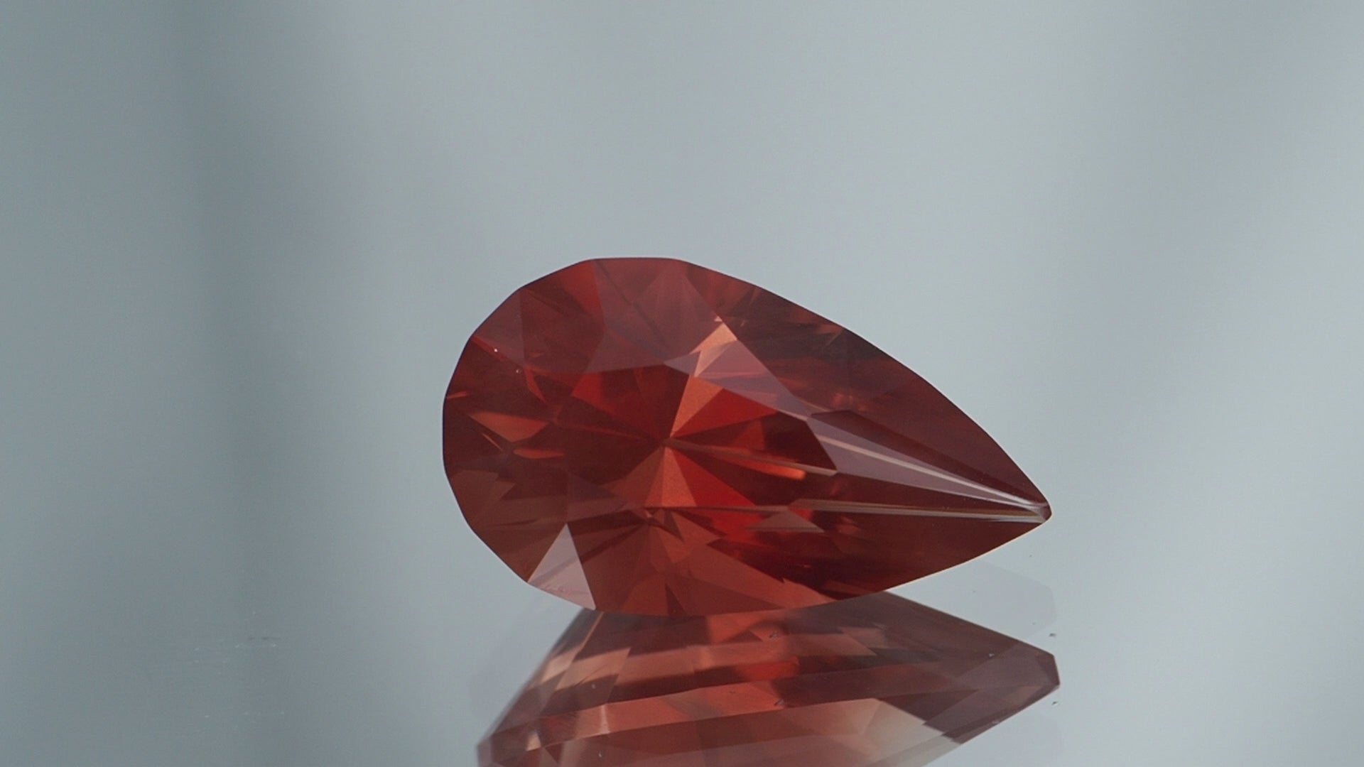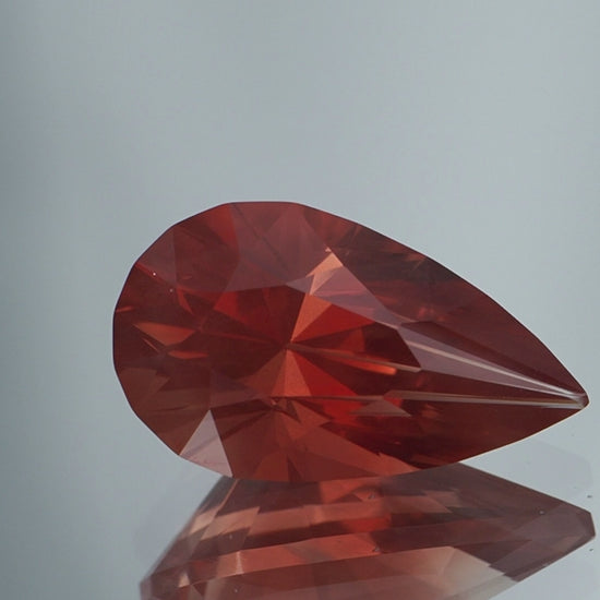 Imagine holding a remarkable Oregon sunstone, weighing 9.47 carats and fashioned into a pear cut measuring 19.17mm by 11.16mm. This exceptional gemstone displays a vivid shade of red that commands attention, enriched by distinctive inclusions that contribute to its unique character. The color of the sunstone exudes vibrancy and depth, reminiscent of a rich and passionate hue that captivates the eye. The pear cut enhances the sunstone's natural elegance, with its rounded end and tapering point creating a graceful and elongated shape. Despite the presence of inclusions, the gem retains its inherent sparkle and brilliance, reflecting light in a captivating display. Each facet of the Oregon sunstone is meticulously polished to highlight its vibrant red coloration, ensuring it dazzles with every movement. This gemstone is not just a piece of jewelry but a statement of natural beauty and individuality, making it a prized addition to any collection.