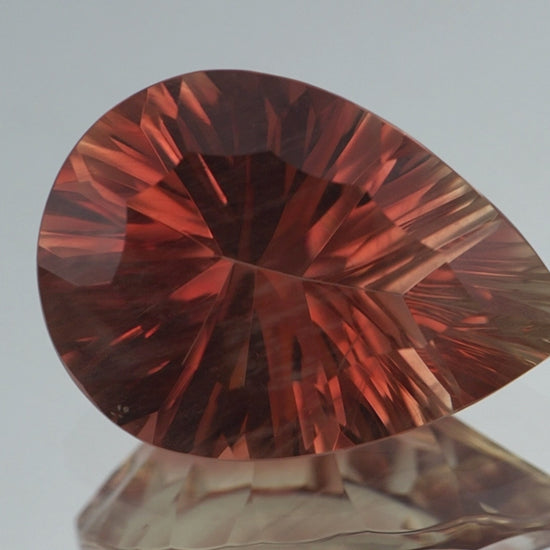 The Oregon Sunstone featured here is a stunning example of this unique and rare gemstone. Weighing in at 8.54 carats, this stone measures 18mm by 12.80mm and showcases a masterful concave pear cut, enhancing its natural brilliance and depth. The pear shape of the sunstone, with its graceful curves and pointed tip, adds an elegant touch, making it an exquisite choice for fine jewelry. The gemstone displays a red color with peach tones, characteristic of high-quality Oregon Sunstones. Additionally, it features intriguing schiller inclusions, which add a captivating internal shimmer to the stone. The play of light within the sunstone reveals intricate patterns, enhancing its overall allure. The precise cutting and polishing work done on this stone ensures that it captures and reflects light beautifully, making it a true standout piece.