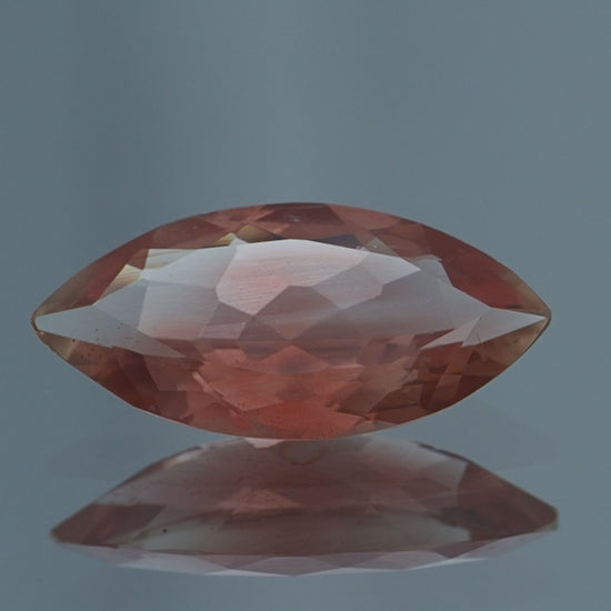 This 2.79 carat marquise-cut Oregon Sunstone, measuring 16.06mm by 8.10mm, exhibits a stunning peach hue complemented by captivating schiller inclusions. The peach color of the stone exudes warmth and softness, reminiscent of a sunset over Oregon's serene landscapes. Within the gem, the schiller effect adds a subtle iridescence, creating flashes of light that dance across its surface and enhance its overall brilliance. The marquise cut enhances the Sunstone's elegance with its elongated shape and pointed ends, allowing light to reflect and refract through the stone's facets, showcasing its natural clarity and sparkle. Mined from Oregon's volcanic terrain, this 2.79 carat Oregon Sunstone with schiller is a rare and prized gemstone known for its unique color and natural inclusions. Whether set as a centerpiece in a ring to highlight its size and shape or as a pendant where its elongated form can catch and reflect light, this Sunstone promises to captivate with its natural beauty and timeless charm, making it a cherished addition to any jewelry collection.