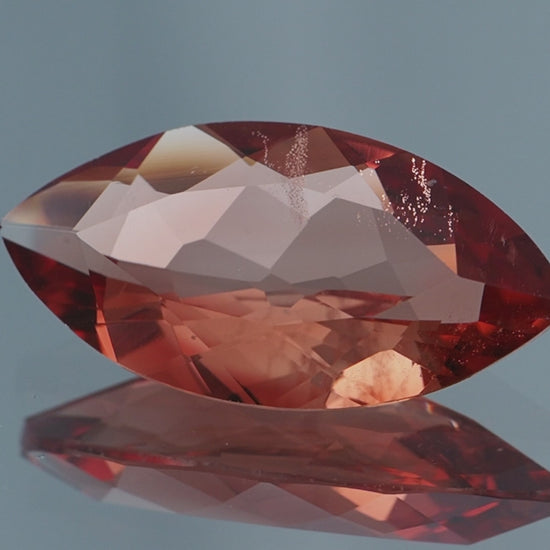 This 5.93 carat marquise-cut Oregon Sunstone, measuring 20.13mm by 10.07mm, displays a striking red hue complemented by captivating schiller inclusions. The deep red color of the gem exudes warmth and richness, reminiscent of a fiery sunset over Oregon's rugged landscapes. Within the stone, the schiller effect adds a subtle iridescence, creating flashes of light that dance across its surface and enhance its overall brilliance. The marquise cut enhances the Sunstone's elegance with its distinctive elongated shape and pointed ends, allowing light to reflect and refract through the gem's facets, showcasing its natural clarity and sparkle. Mined from Oregon's volcanic terrain, this 5.93 carat Oregon Sunstone with schiller is a rare and prized gemstone known for its intense color and natural inclusions. Whether set as a centerpiece in a ring to highlight its size and shape or as a pendant where its elongated form can catch and reflect light, this Sunstone promises to captivate with its natural beauty and timeless charm, making it a cherished addition to any jewelry collection.